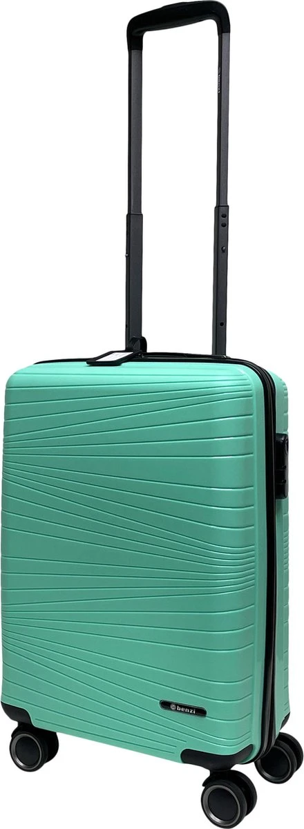Hardschalen handbagage koffer van het merk Benzi, gemaakt van lichtgewicht polypropyleen. De koffer is voorzien van een ritssluiting rondom die op slot te zetten is middels een vast cijferslot op de zijkant van de koffer. Binnenin gevoerd, spanbanden en tussenschot met ritssluiting. Op het tussenschot zit een ritsvak en twee steekvakken voor het overzichtelijk opbergen van kleine reisaccessoires. Handvat op bovenkant, uitschuifbare trekstang en comfortabel 4-wiel systeem. Voorzien van adreslabel.