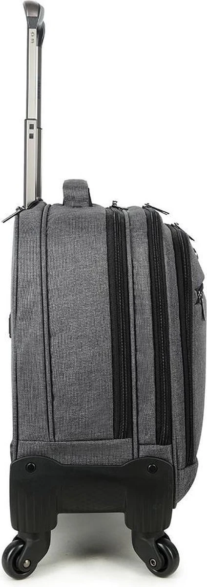 Op de voorzijde van de trolley zit een groot ritsvak met daarin een organizer voor het overzichtelijk opbergen van pennen, smartphone, sleutels en andere kleine reisaccessoires. Helemaal voorop zit nog een insteekvak met ritssluiting voor dingen die je snel bij de hand wilt hebben zoals bijv. je telefoon of reisdocumenten. Op de achterzijde zit een vast adreslabel en bovenop de trolley zit een stevig handvat voor het snel en makkelijk oppakken van de trolley. De 4 zwenkwielen en uitschuifbare trekstang zorgen voor optimaal reiscomfort.