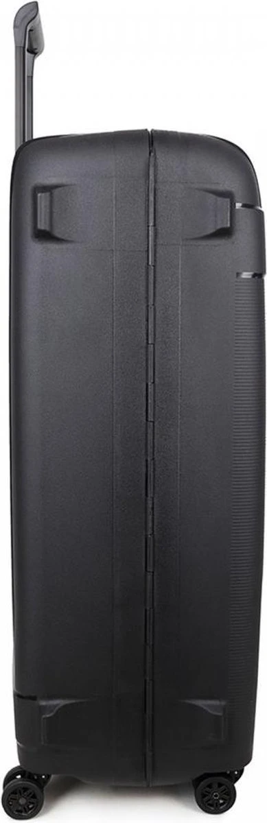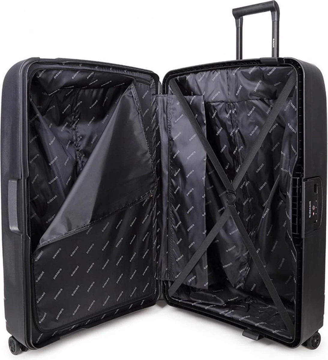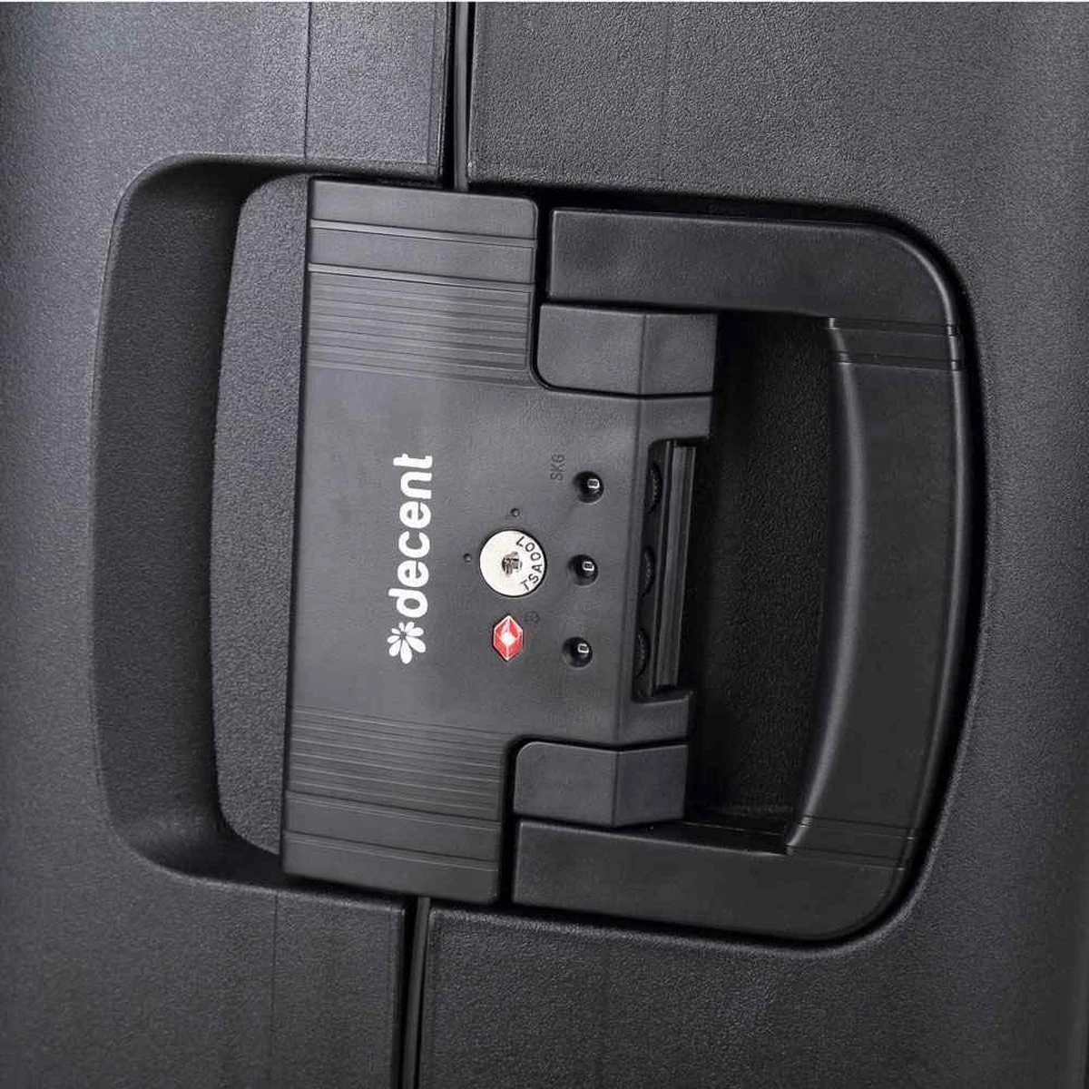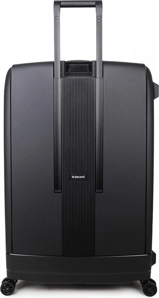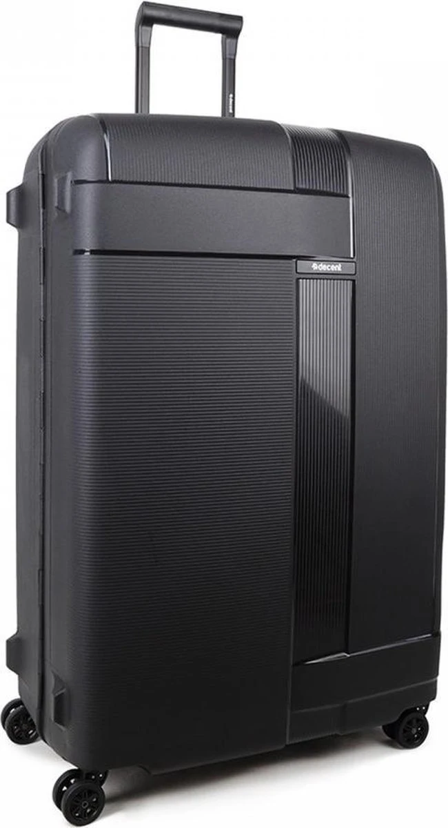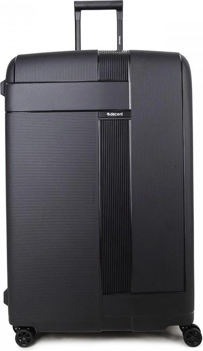 Grote polypropyleen hardschalen koffer uit de Transit serie van het merk Decent. De koffer is rondom voorzien van drie kliksloten. Op de boven-en onderkant zitten sloten die u vastklikt en op de zijkant zit het hoofdslot dat een TSA cijferslot is. De koffer heeft een zwarte voering, een tussenschot met rits, een extra ritsvak en is voorzien van spanbanden. Handvat op bovenkant en zijkant en voorzien van een comfortabel dubbel 4-wiel systeem.