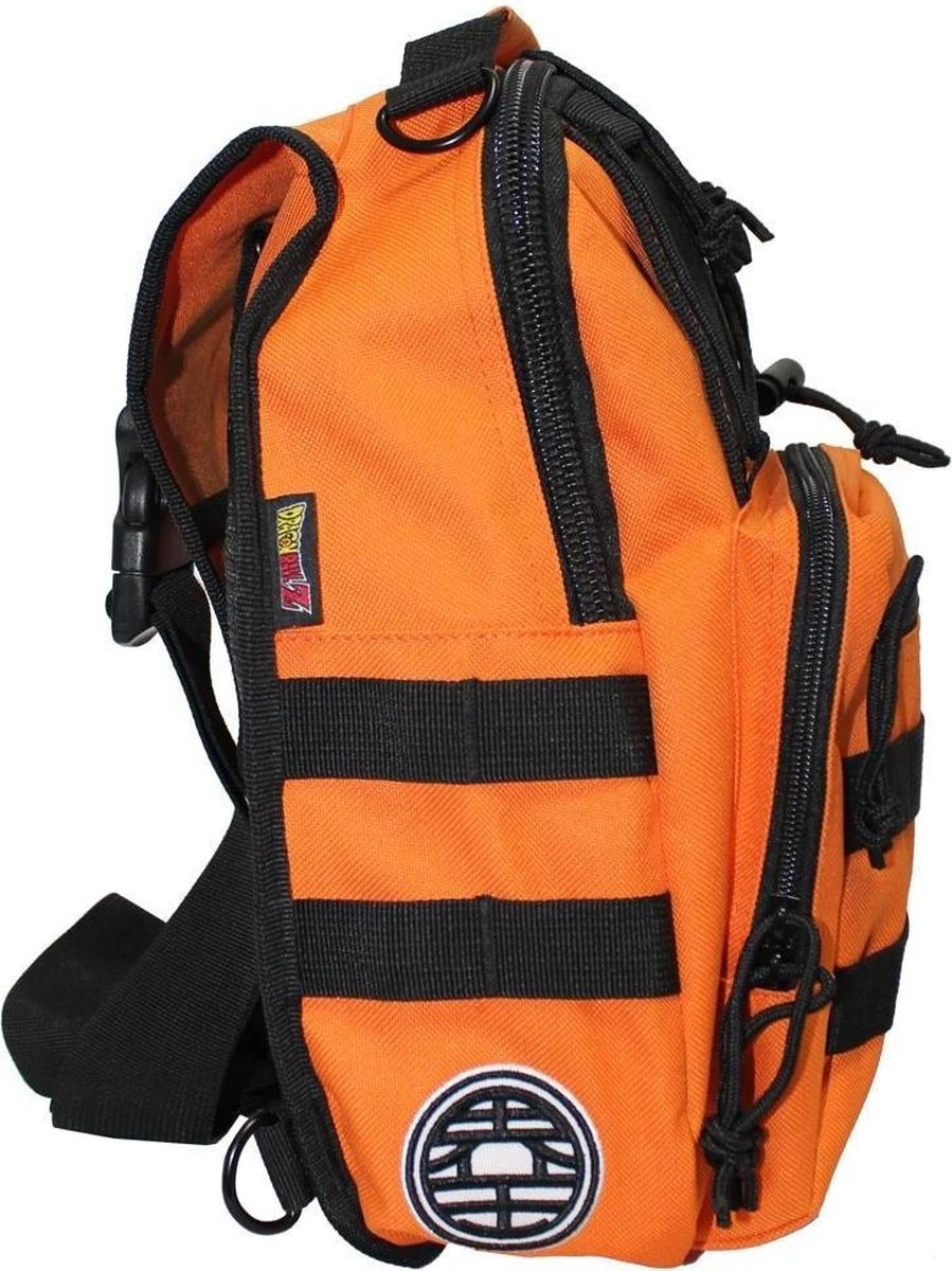 Stoere sling rugtas van Dragonball Z. De rugzak heeft 1 verstelbare schouderband en heeft de kleuren oranje/zwart. De rugtas heeft een voorvak en een groot hoofdvak verdeeld in 2 vakken.
