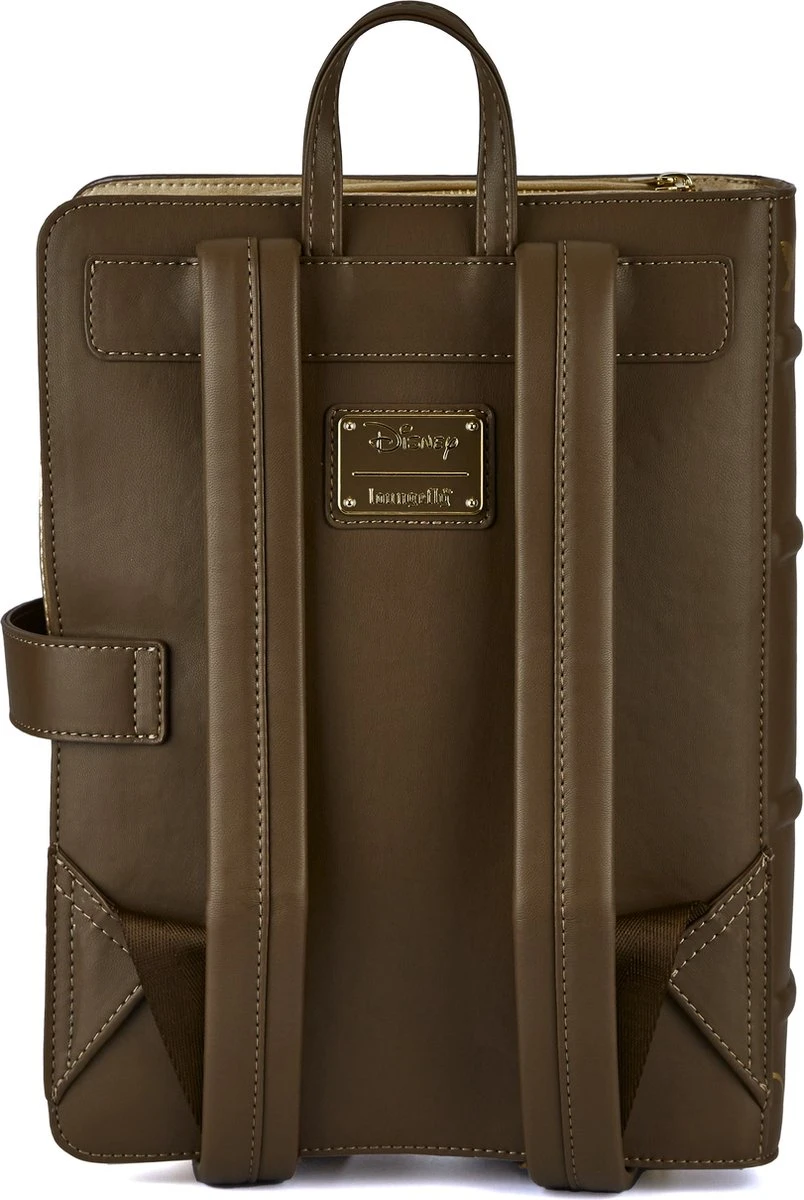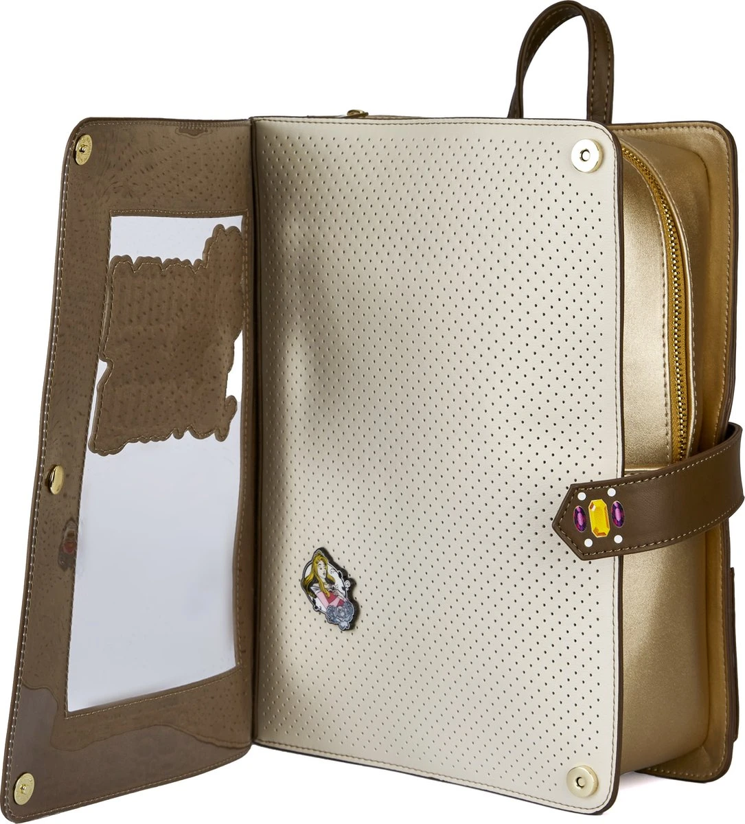 De rugzak, met goudkleurige rits en vakken aan weerszijden, bevat dromerige taferelen van Aurora, haar kasteel en haar prins. Boven Aurora en prins Phillip staat geschreven: “En ze leefden nog lang en gelukkig”. Applique, geborduurde en bedrukte details sieren de voor- en achterkant van de rugzak. De buitenkant is van veganistisch leer (polyurethaan). De schouderbanden zijn verstelbaar.