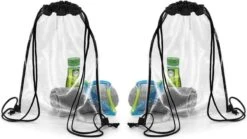 2x stuks transparante gymtasjes/rugtasjes/rugzakjes/zwemtasjes met zwart koord, geschikt voor kinderen en volwassenen. Afmeting: ca. 33 x 45 cm. Inhoud: ca. 11 liter. Materiaal: waterafstotend thermoplastic polyurethane (tpu). Doorzichtige rugtasjes voor o.a. festivals voor volwassenen.