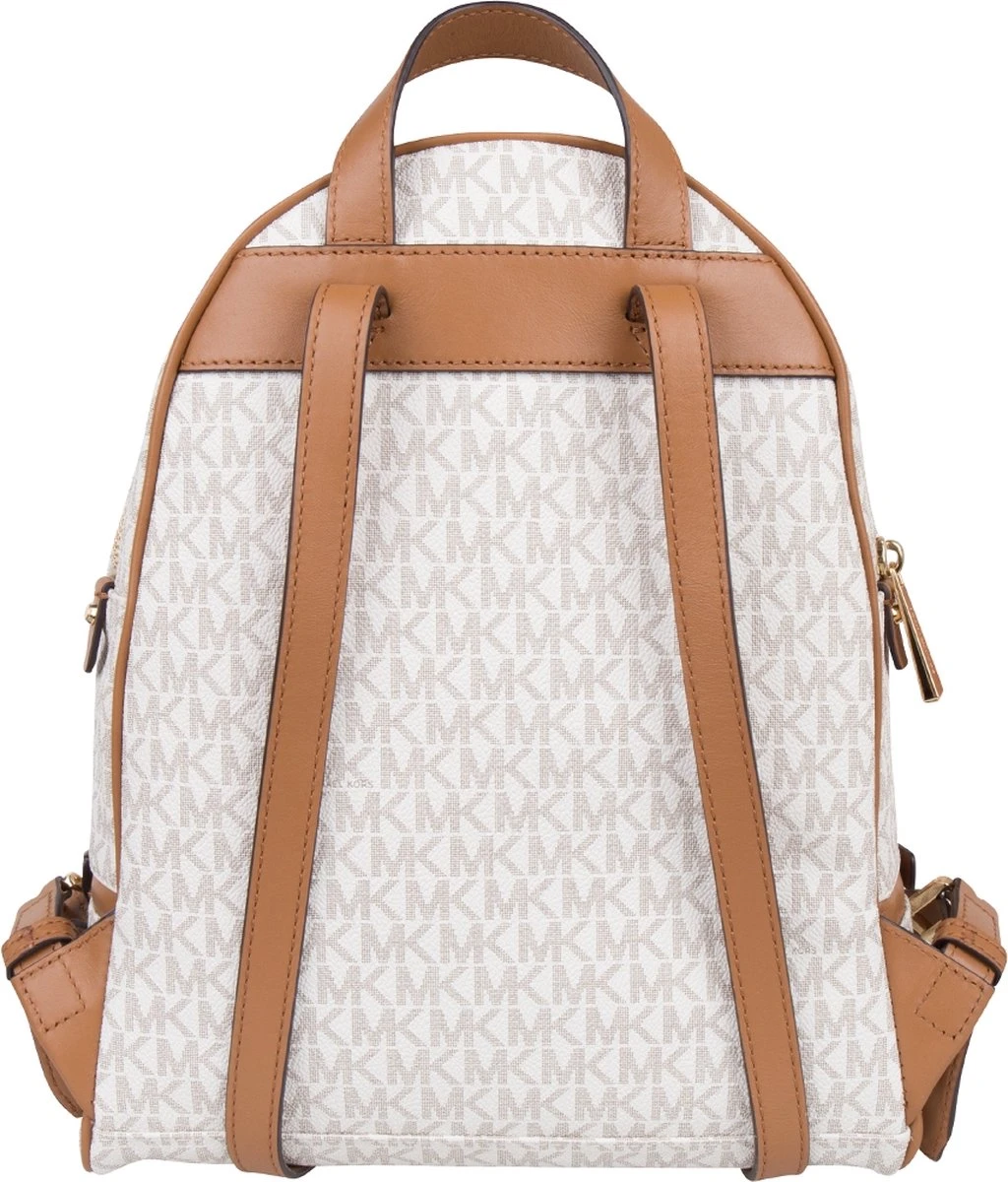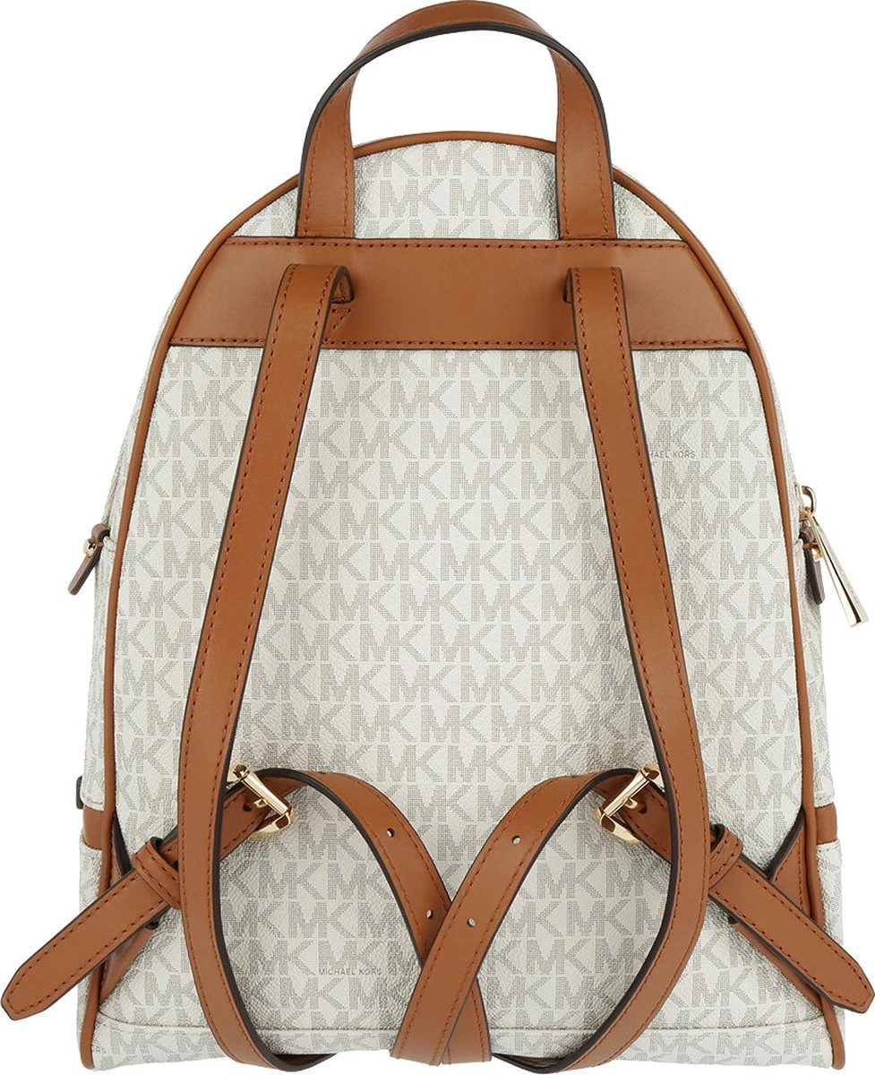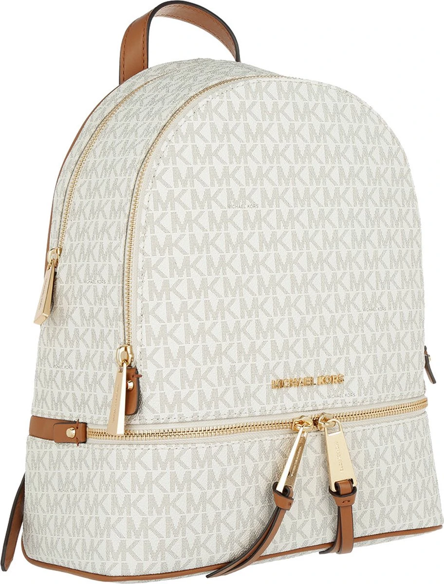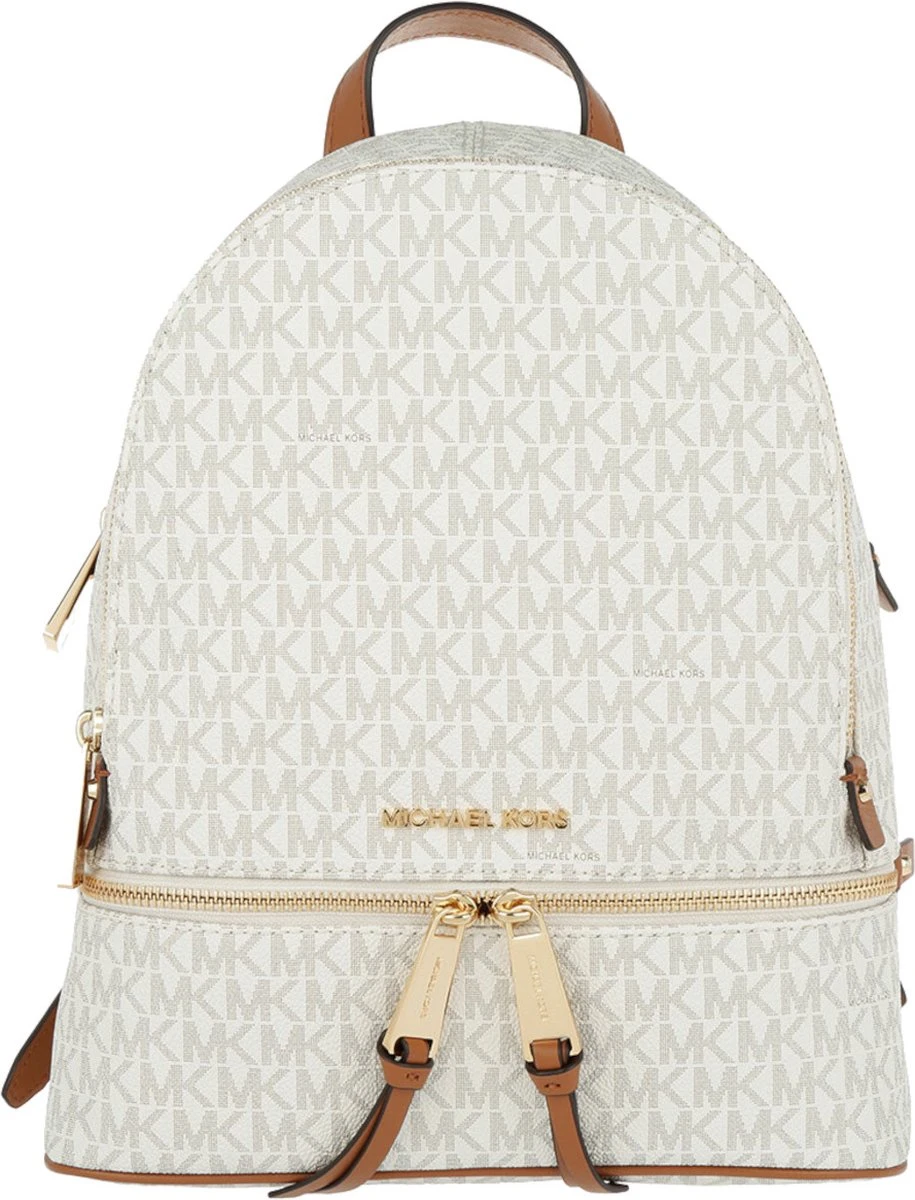 Deze Michael Kors Rhea rugzak heeft ondanks het bescheiden formaat meer dan voldoende opbergruimte. De tas is gemaakt van stevig kunstleder met een ruwe, voelbare structuur en is geheel voorzien van een opvallende logoprint. De snijvlakken van de lederen draagbanden hebben een contrasterende kleur uitgevoerd, de lederen patches hebben opvallende gouden studs en bovendien is de tas voorzien van chique lichtbruine piping. Dit geeft in combinatie met de subtiele goudkleurige details een luxueuze en eigentijdse uitstraling. Deze damesrugtas heeft twee openritsbare voorvakken en een hoofdvak. Het hoofdvak heeft vier zijvakjes van verschillende grootte en zowel een breed open als afsluitbaar zijvak voor smartphone of portemonnee.
