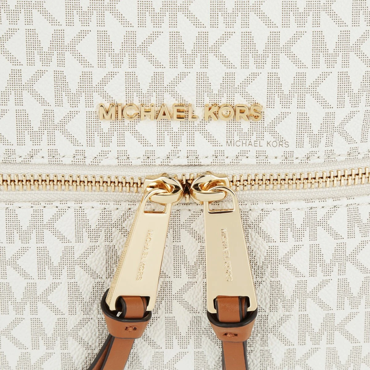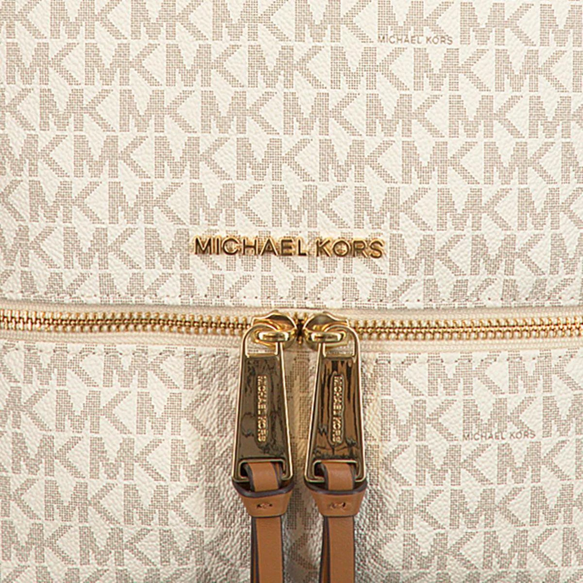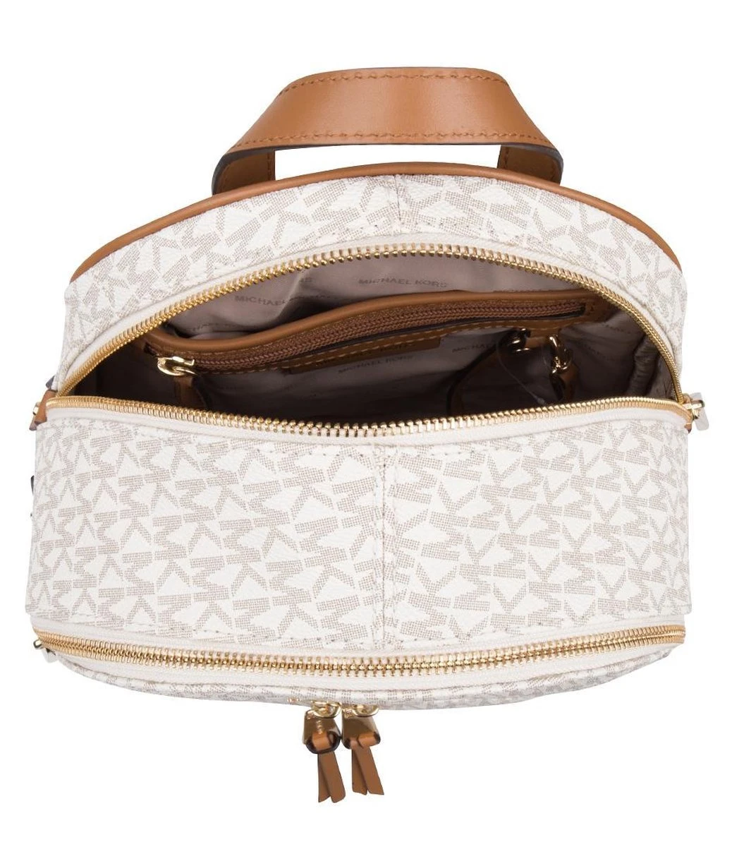 Deze Michael Kors Rhea rugzak heeft ondanks het bescheiden formaat meer dan voldoende opbergruimte. De tas is gemaakt van stevig kunstleder met een ruwe, voelbare structuur en is geheel voorzien van een opvallende logoprint. De snijvlakken van de lederen draagbanden hebben een contrasterende kleur uitgevoerd, de lederen patches hebben opvallende gouden studs en bovendien is de tas voorzien van chique lichtbruine piping. Dit geeft in combinatie met de subtiele goudkleurige details een luxueuze en eigentijdse uitstraling. Deze damesrugtas heeft twee openritsbare voorvakken en een hoofdvak. Het hoofdvak heeft vier zijvakjes van verschillende grootte en zowel een breed open als afsluitbaar zijvak voor smartphone of portemonnee.