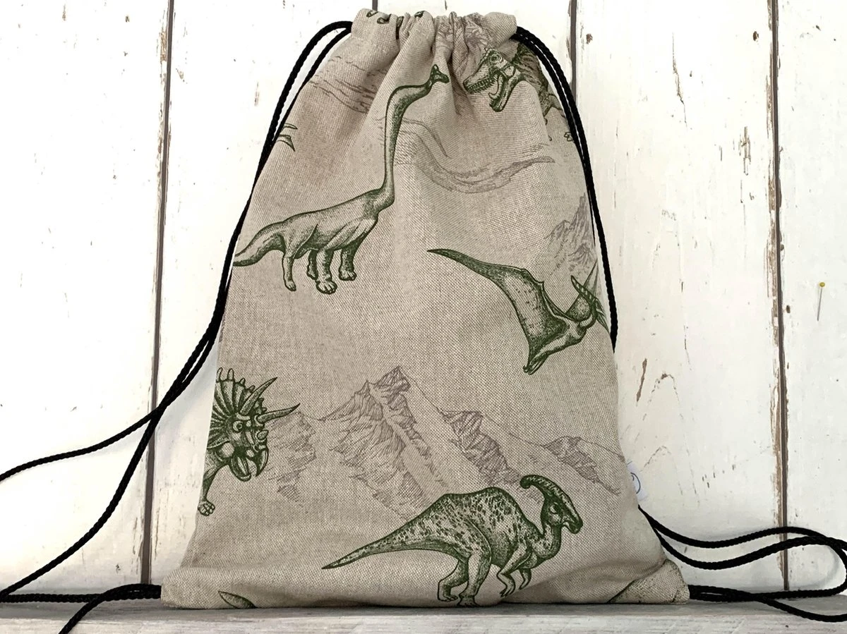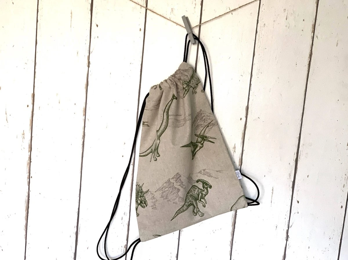 Super stoer rugtasje met groene dino’s voor jongens. Dit tasje met rijgkoord is ideaal om te gebruiken als gymtas of zwemtas.