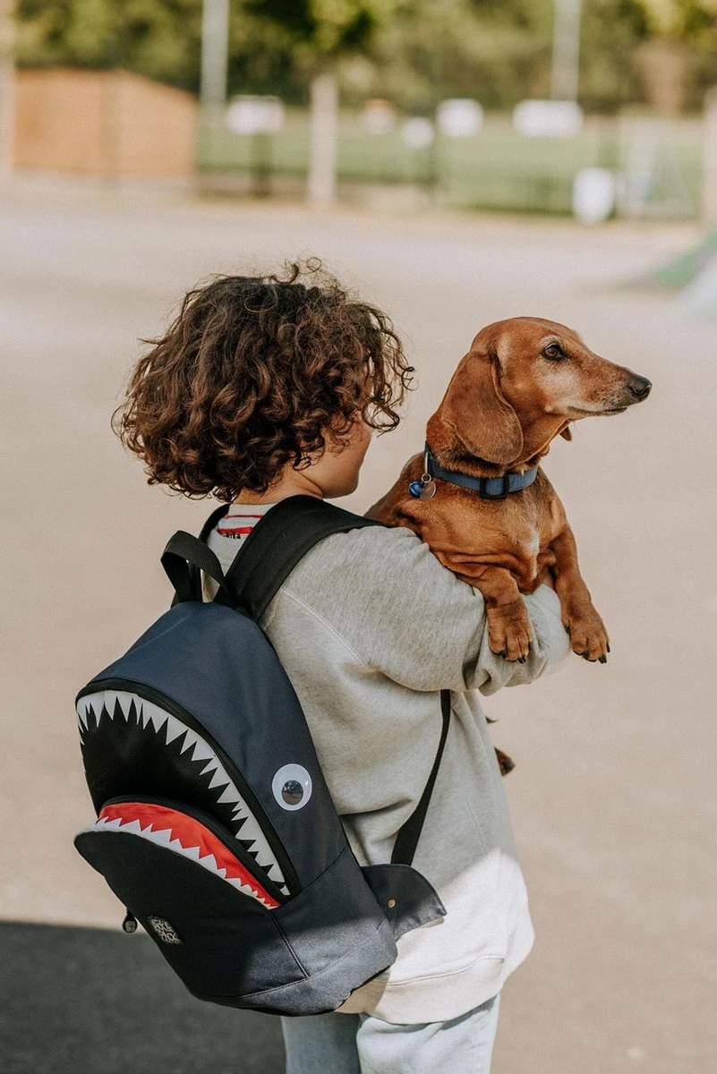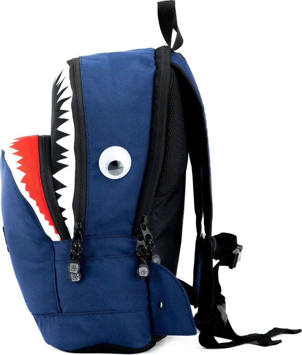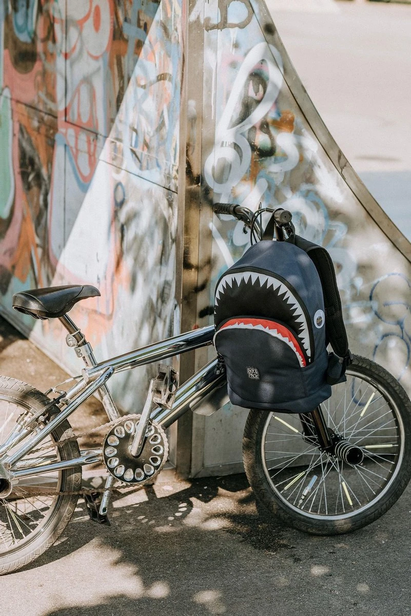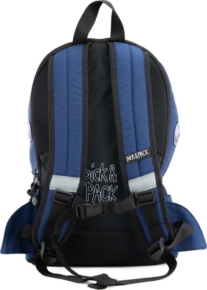 Pick & Pack rugzak in de vorm van een haai voor kinderen van 5 jaar en ouder. Dankzij het juiste formaat is de rugtas geschikt voor A4 formaat schoolspullen, een lunchbox en alle andere benodigdheden. Voorzien van een speciaal vak voor een drinkfles. Aan de binnenzijde zit een klein ritsvakje, vakje voor telefoon en een makkelijke sleutelhouder. Met daarop een adres label voor naam, adres en telefoonnummer. Makkelijk voor als de rugtas eens ergens wordt vergeten! Een apart gewatteerd vak is bereikbaar met een rits, hierin kunnen boeken of een 13inch laptop of ipad worden opgeborgen. Voorop een borstbandje om de rugzak stevig vast te maken tijdens het lopen. De rugtas is ook voorzien van kleine reflecterende details zodat je ook in het donker opvalt. Dankzij de gewatteerde schouderbanden en het ergonomische rugdeel is de tas goed door het kind zelf te dragen.