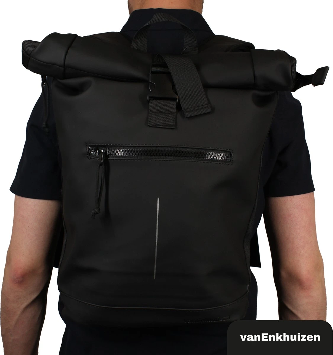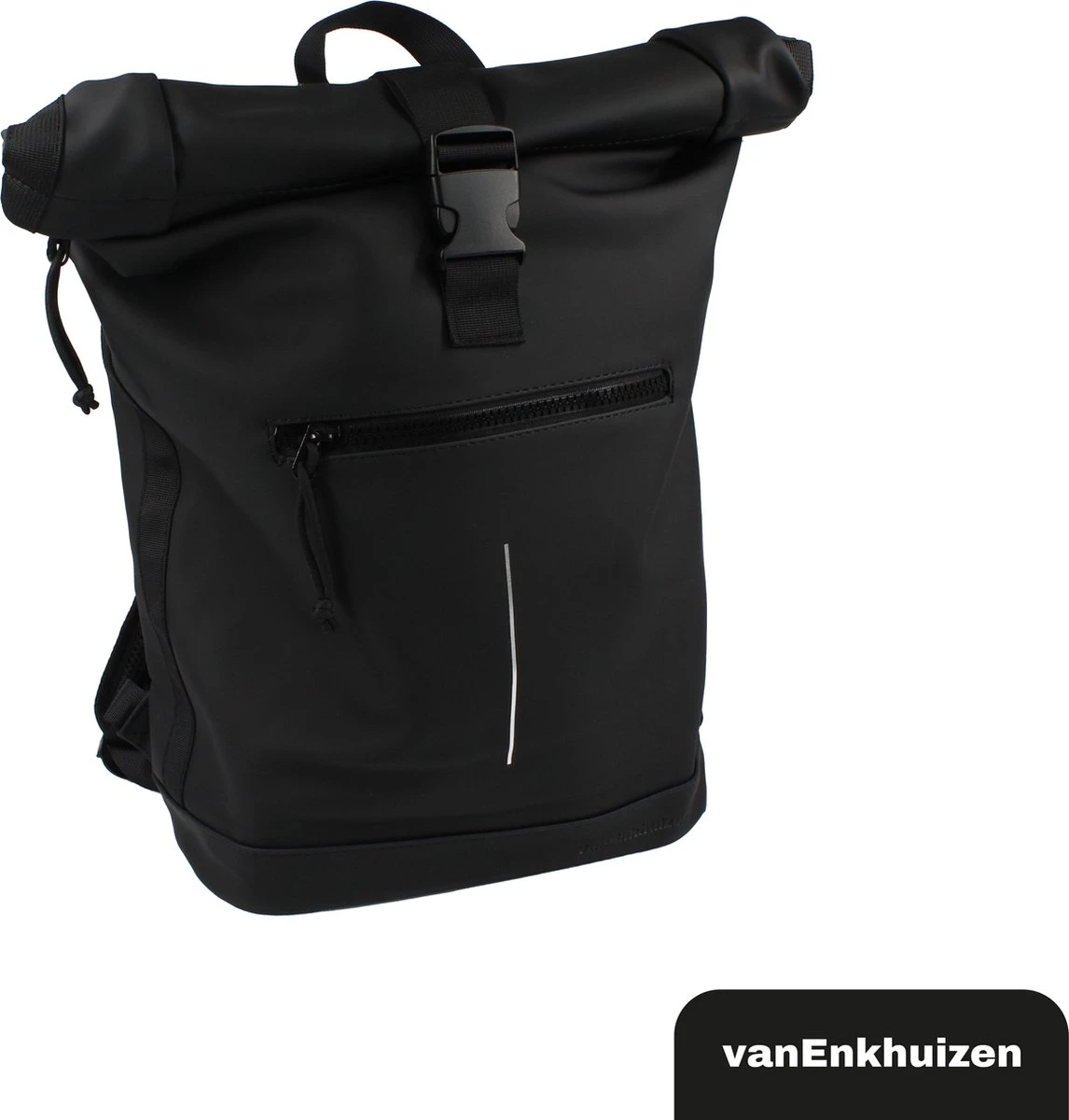 Neem je spullen overal mee naartoe in deze stijlvolle van Enkhuizen Rolltop Rugzak voor dames en heren. Maak de rugtas groter en kleiner door de sluiting op of uit te rollen. Het laptopvak biedt ruimte aan een 15,6 inch laptop, die droog blijft via het waterafstotende Tarpaulin. Houd je spullen warm of koud dankzij de thermo binnenzijde en gebruik de ritsvakken om kleine spullen weg te stoppen. Veilig de weg op in het donker is geen probleem door de reflectie strip op de rugzak. De gewatteerde schouderbanden zorgen voor ideaal draagcomfort, waardoor deze handige tas onmisbaar wordt.